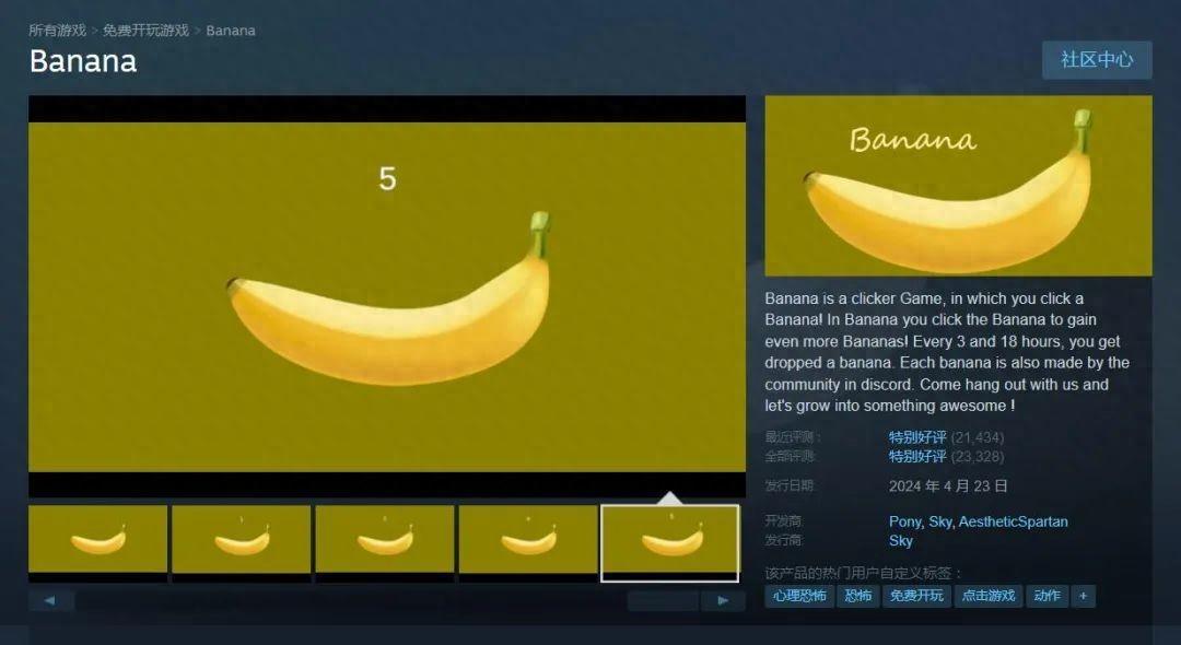 假如你運氣好,掉落了一根閃閃發光的宇宙無敵大香蕉,價格自然也就水漲船高。就在前幾天,一個售價超過1萬人民幣的香蕉,就達成了一次交易。賺到的錢,是以不能提現的Steam餘額的方式入賬。但玩家可以通過買入CS2或其他遊戲皮膚飾品,並在第三方平臺以人民幣結算的方式提現,雖然官方說不建議這麼做就是了。畢竟在CS2裏,遊戲偶爾也會給你掉落可交易的飾品、箱子。比如說我曾經在2021年打 CSGO的時候,意外掉落了當時新版本剛出的武器箱,最後直接在第三方APP裏賣了50塊錢,那頓晚飯我喫的很開心。但《Banana》太純粹了,純粹到遊戲性基本爲0,唯一重點就是交易了。不過就是這麼一款十分魔幻的“遊戲”,剛推出的時候基本沒有任何風聲,大半個月前都沒什麼人在意。2024年4月23日,《Banana》正式上線,網上壓根沒人關注它,當時全球最流行的香蕉Tiktok 上的big banana dance。就是那個“大香蕉一條大香蕉,你的感覺真的很奇妙”。那時候《Banana》充其量就是一款egglike遊戲——不是說香蕉和雞蛋長得像,而是說在《Banana》之前,就有一款叫做《Egg》的遊戲,玩法和《Banana》一毛一樣:點擊雞蛋,獲得雞蛋,賣錢。