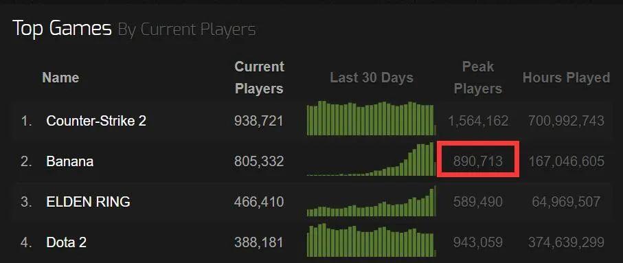 有多熱門呢?在Steam上,《Banana》6月14日的同時在線人數突破了40萬,然後就用了一週時間,把這個成績翻倍了,在線峯值接近90萬。在這幾天,比《Banana》還熱門的遊戲,就只有萬年常青樹CS2這一款,剛發售的老頭環DLC根本吸不到尾氣。