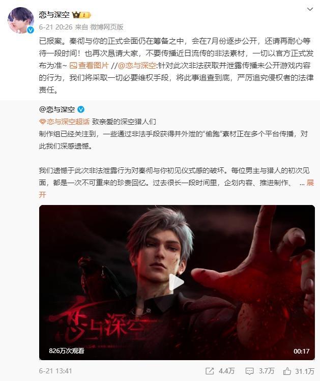 這周,《戀與深空》就因爲新版本素材被外泄、偷跑,提前公佈了新男主的PV,並對泄密事件進行全面調查。這個做法和此前被泄露新陣營信息的《絕區零》如出一轍。