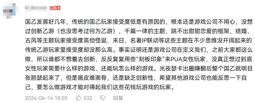 在三週年評論區中,有不少玩家提到,他們不願意被世俗看法定義,不想被人用刻板眼光評判“女性玩家需要什麼樣的遊戲、還能玩怎麼樣的遊戲”。《光夜》的活動之所以能在市場打出成績,或許關鍵之一就在於,他們思路打開、放手大膽做出了套路之外的內容,幫着部分玩家喊出了捅破刻板印象的聲音。