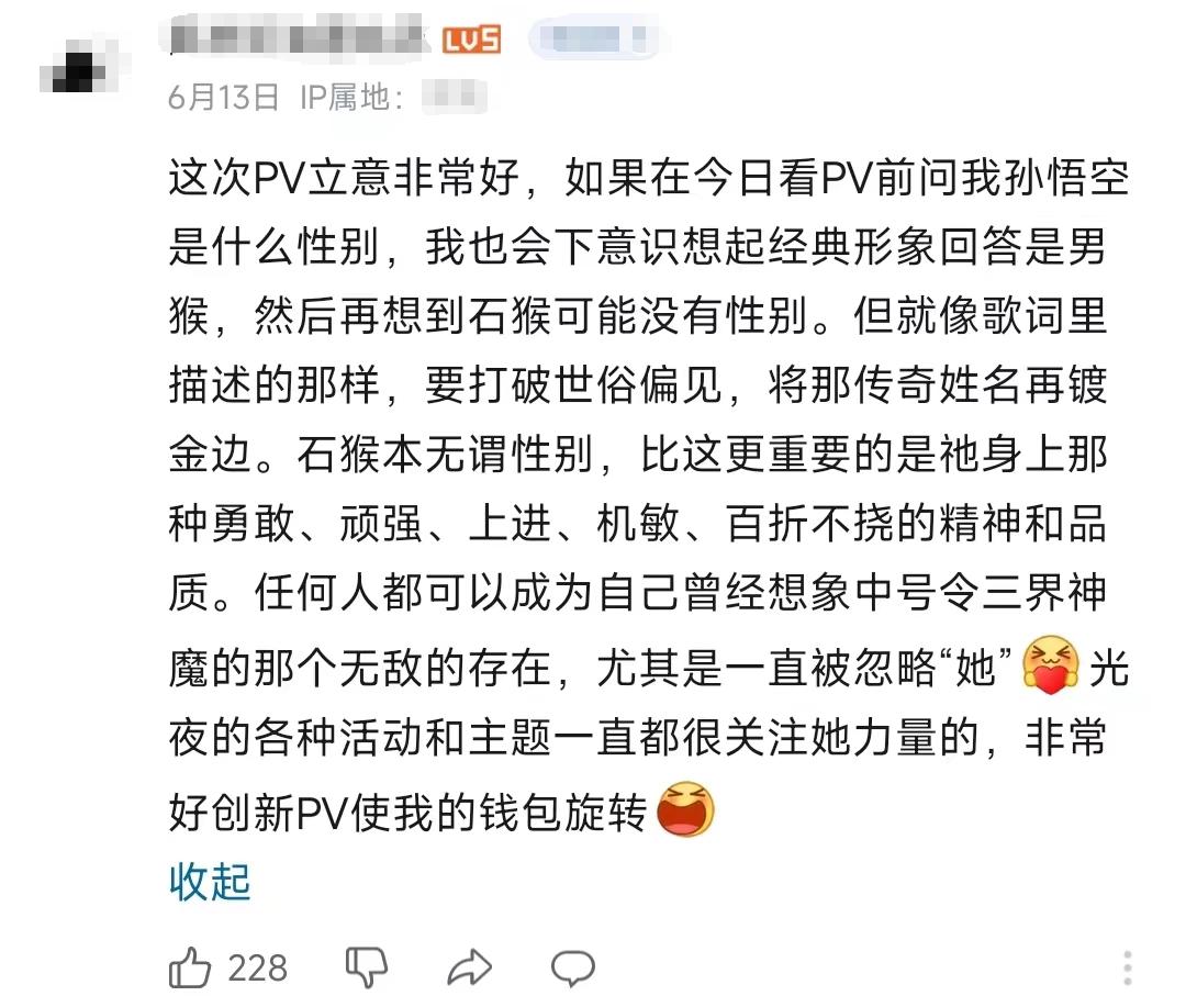 很多女性其實有當大聖的夢想,只是在刻板印象中,這種訴求是被忽視、也不被看好的——女孩子怎麼會喜歡打打殺殺?而《光夜》此舉,將這個被長期藏在暗處的訴求抬了出來,打破了禁錮女性訴求的刻板印象。