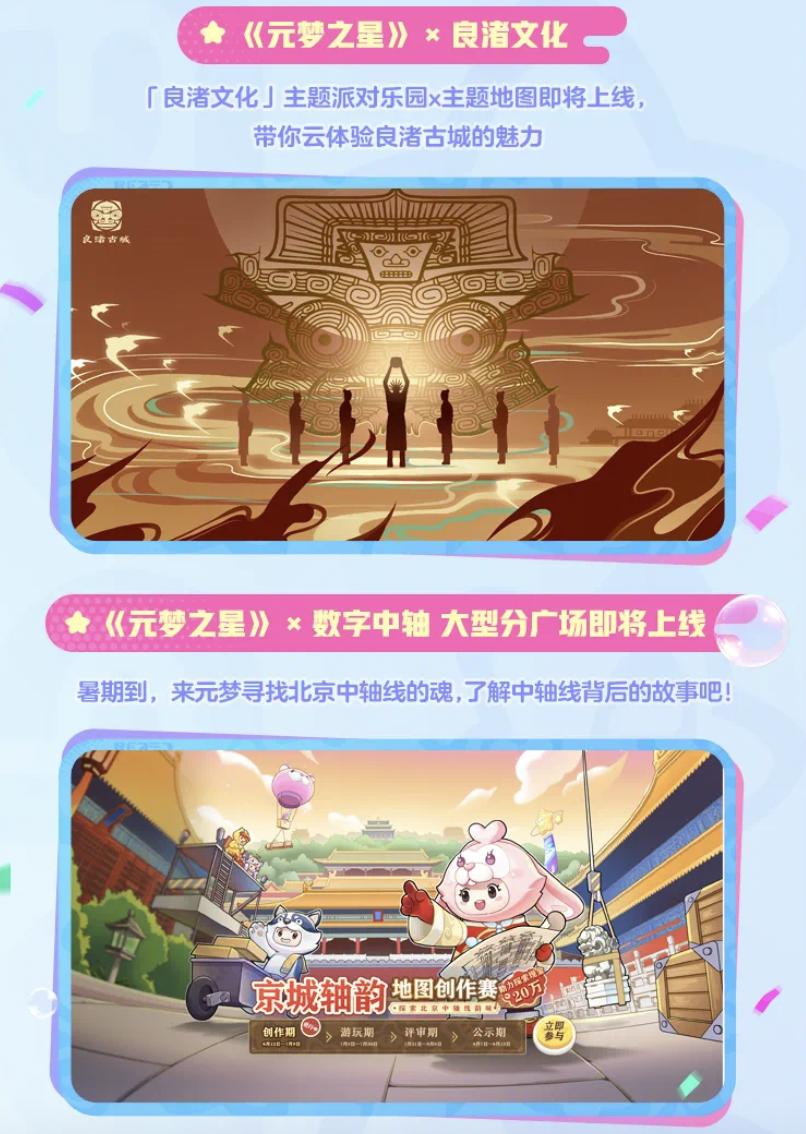 UGC領域就更不用說了。近些年來UGC是行業大勢,而《元夢之星》算得上是天美在UGC領域的探路之作。這次半週年,《元夢之星》則與良渚文化、數字中軸線合作,在遊戲裏做了主題地圖,後續也將開啓首屆全國高校遊戲創意大賽的頒獎儀式。