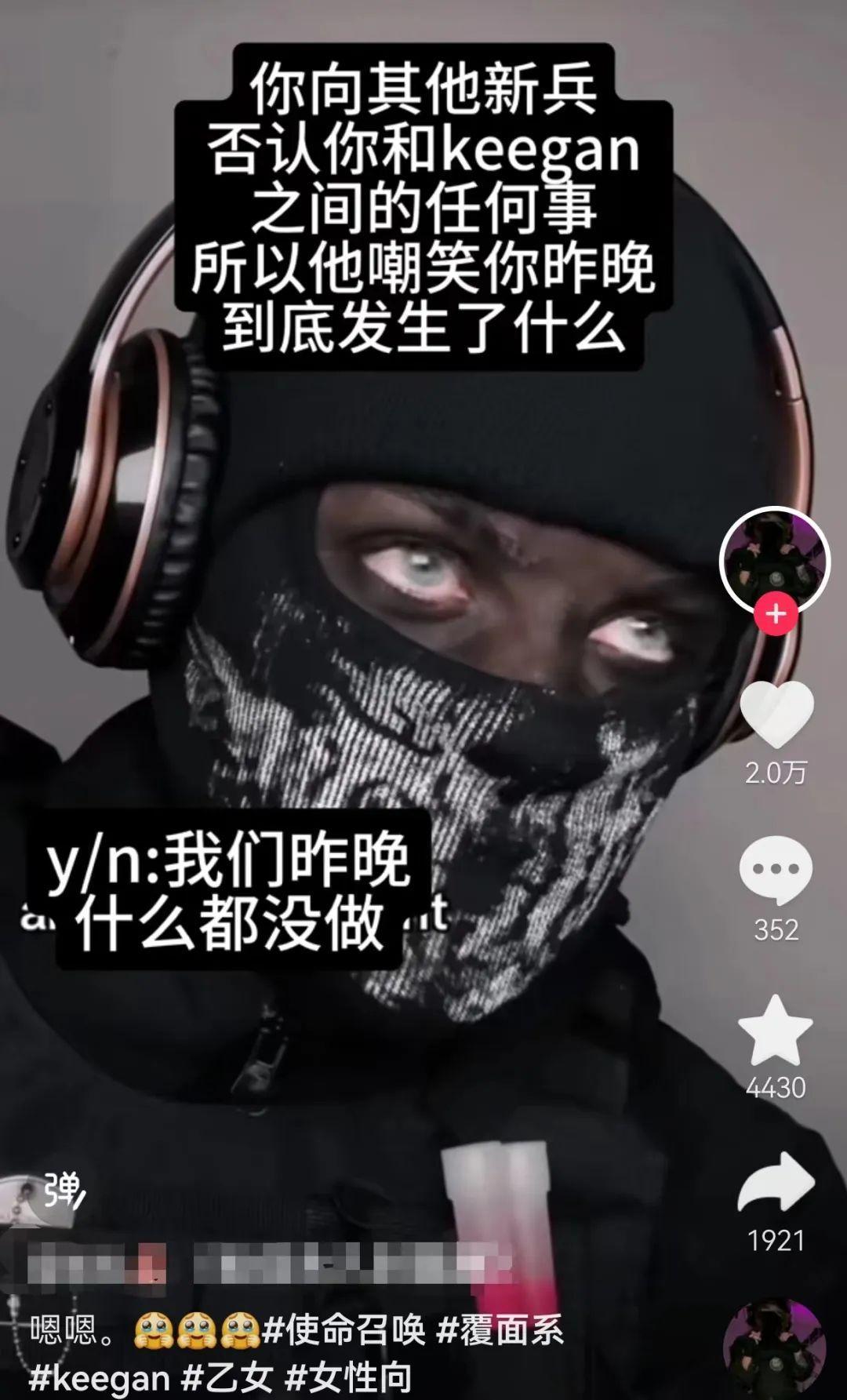 他們延續了過去TIKTOK博主的第一人稱夢女向風格,並添加了更多國內抖音最潮流、接地氣的元素,比如什麼”晚安大小姐“什麼喫醋梗,在他們的手裏與COD主題完美融會貫通。