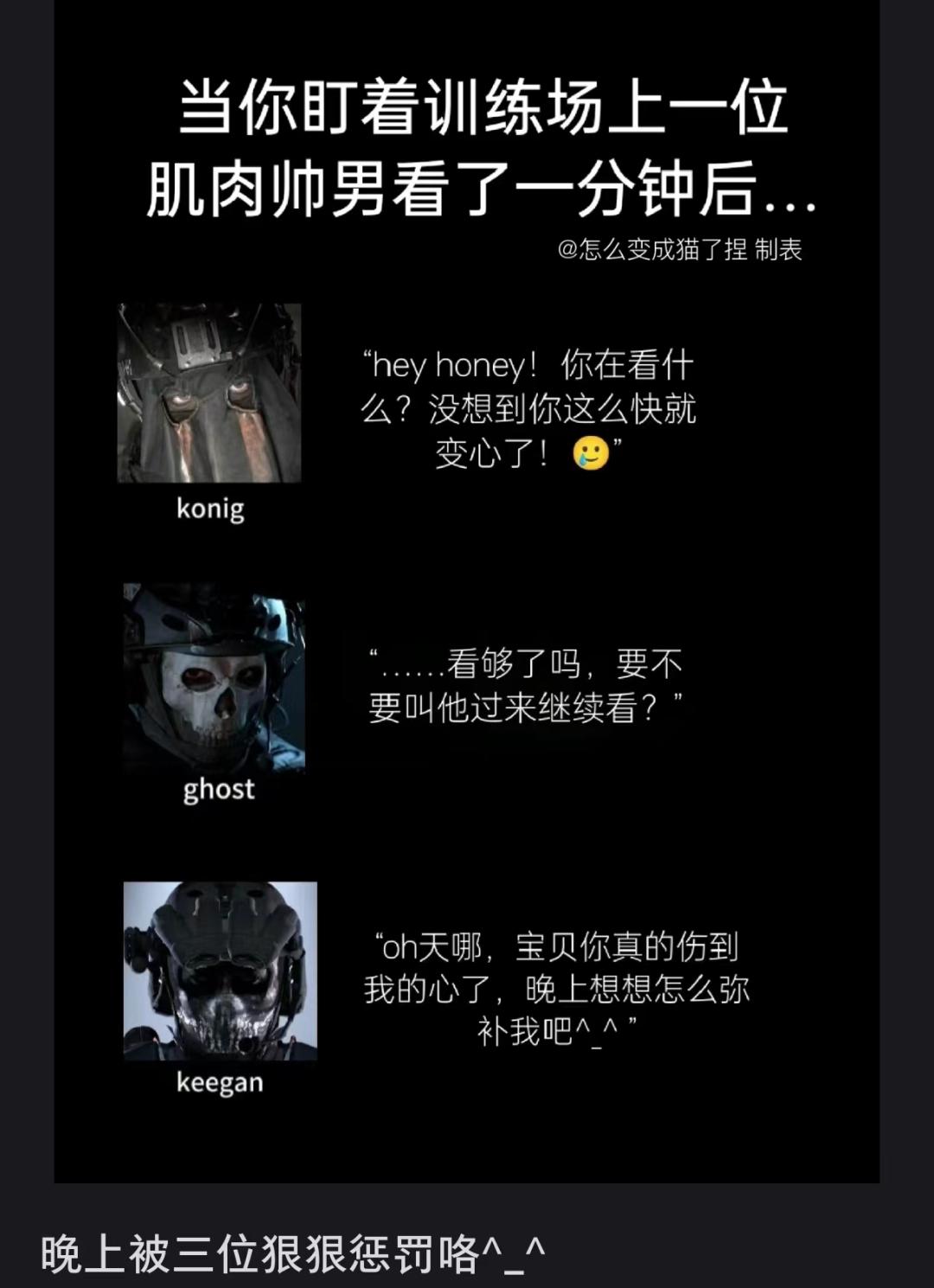當時的我們還在爲Ghost突如其來的人氣而大受震撼,沒想到一年過後這股熱度毫無頹勢,甚至越演越烈把COD系列捧成了當下最受夢女追捧的一般向遊戲。