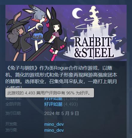 然而《兔子與鋼鐵》在發售後第一週內,其銷量還是快速突破10萬份,算是逆勢取勝。更難能可貴的是,過去不到兩個月的時間裏,這款遊戲的口碑也維持了「好評如潮」的高水準,總計4400多玩家給這款遊戲打出了96%好評。