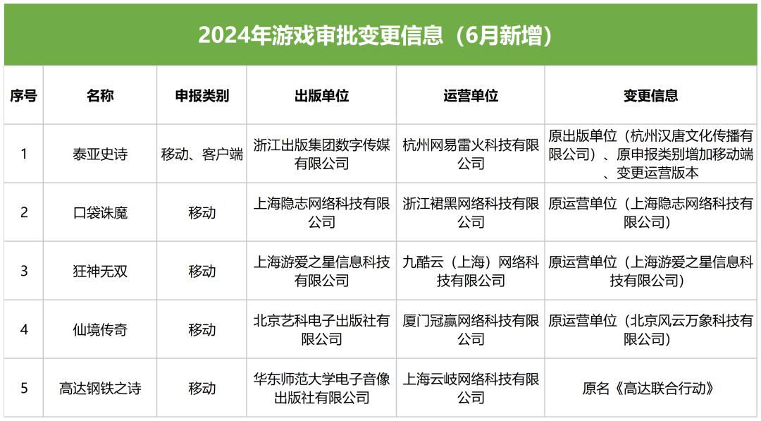 除此之外,本期還有5款遊戲申請變更審批信息(如下圖)。其中網易《泰亞史詩》新增移動端版本,該產品爲網易於2017年上線的中世紀魔幻MMO端遊。