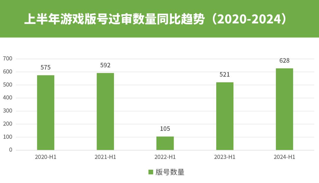 值得注意的是,近兩年版號過審數量整體呈增長態勢,2023年月過審數量均超過86款(8月未發放),2024年每月過審數量則爲100款左右。進一步統計發現,今年上半年已過審版號達628款,爲近5年新高。