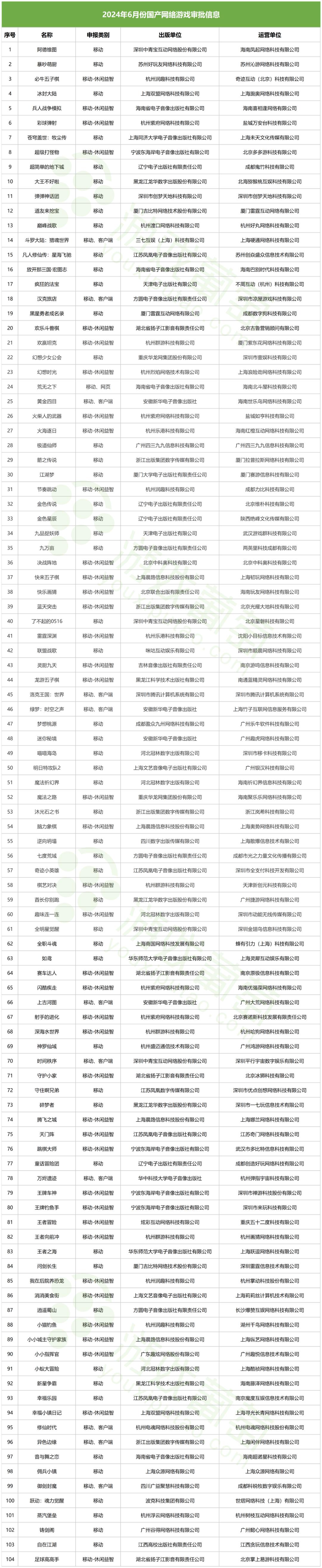 6月25日,國家新聞出版署公佈了2024年6月份網絡遊戲審批信息,共104款遊戲過審,其中11款遊戲包含客戶端版本,一款遊戲包含網頁版本(文末附有完整名單)。