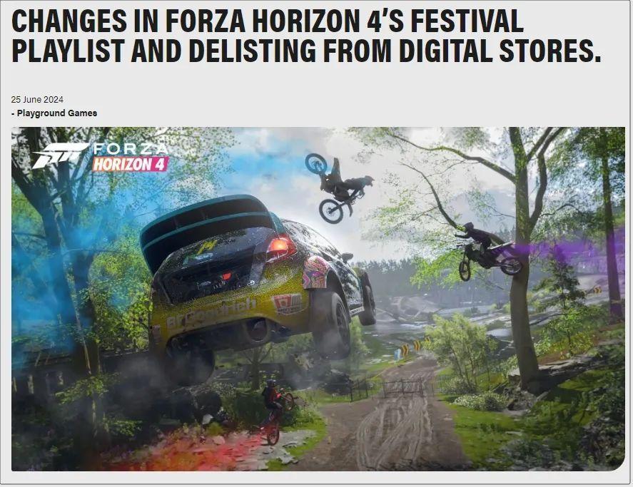由於版權許可證到期,《極限競速:地平線4》的所有DLC將在今天下架,遊戲本體也會在2024年12月從數字商店下架。不過在此公告前購買了DLC,但沒有購買本體的XGP用戶,會收到本體的激活碼作爲補償。