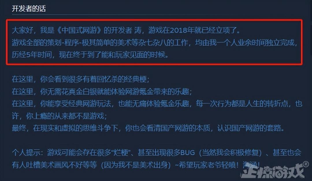 根據Steam商業簡介顯示,這款號稱把矛頭對準中國式網遊亂象的《中國式網遊》,從項目立項到美術繪製,再到玩法策劃,全都由作者一人用業餘時間獨立完成,着實是個狠人。