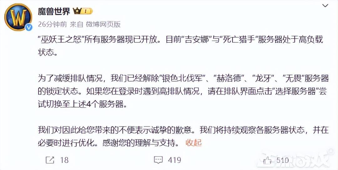 對此,《魔獸世界》官方也是及時補救了一波,把銀色北伐軍、赫洛德、龍牙、無畏這四個老服務器的鎖定給解除了,讓那些請假不上班的新玩家能第一時間玩到《魔獸世界》。