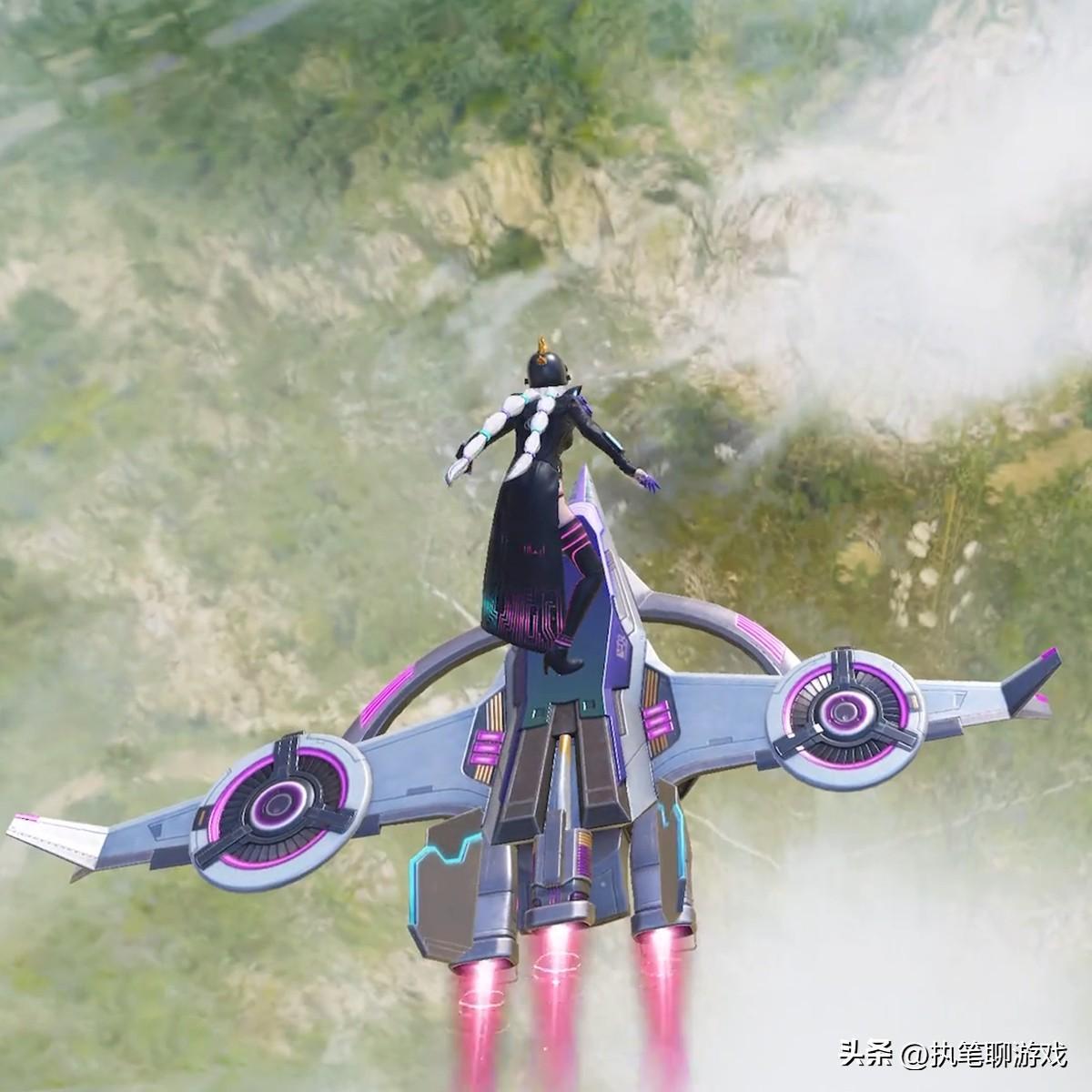 或許是爲了突出“賽博主題”的原因,這套金裝特意加入了大量的光影特效,就連飛行器也是相同的主題設定,外觀酷似戰鬥機,可惜是站姿使用的“踏板”類型,反倒不如當前版本的《和平精英》,因爲自從變形金剛系列上架之後,戰鬥機類型的飛行器已經可以做到“坐姿”使用了。