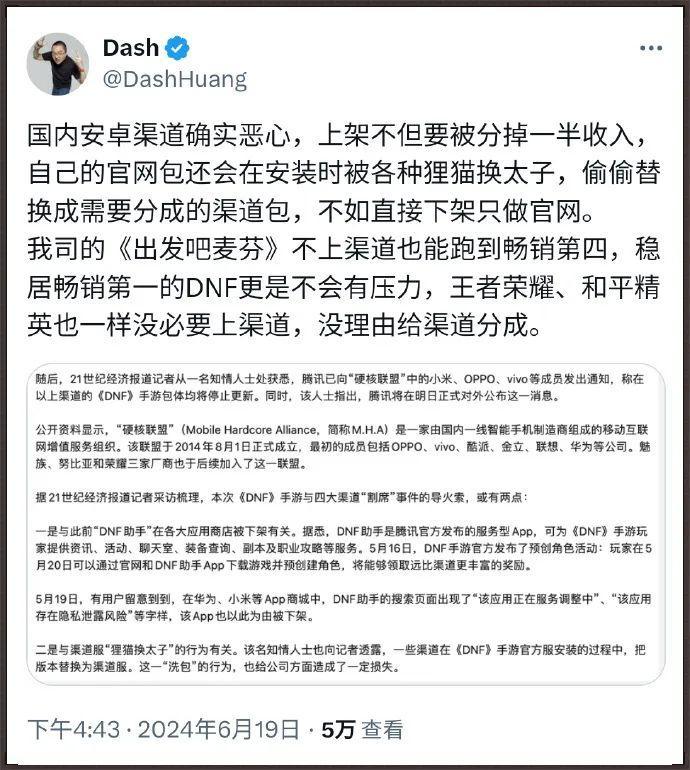前陣子DNF手遊宣佈將在國內大部分應用商店下架的時候,心動網絡CEO、TapTap創始人黃一孟就吐槽過國內安卓渠道五五分成過高的事情。