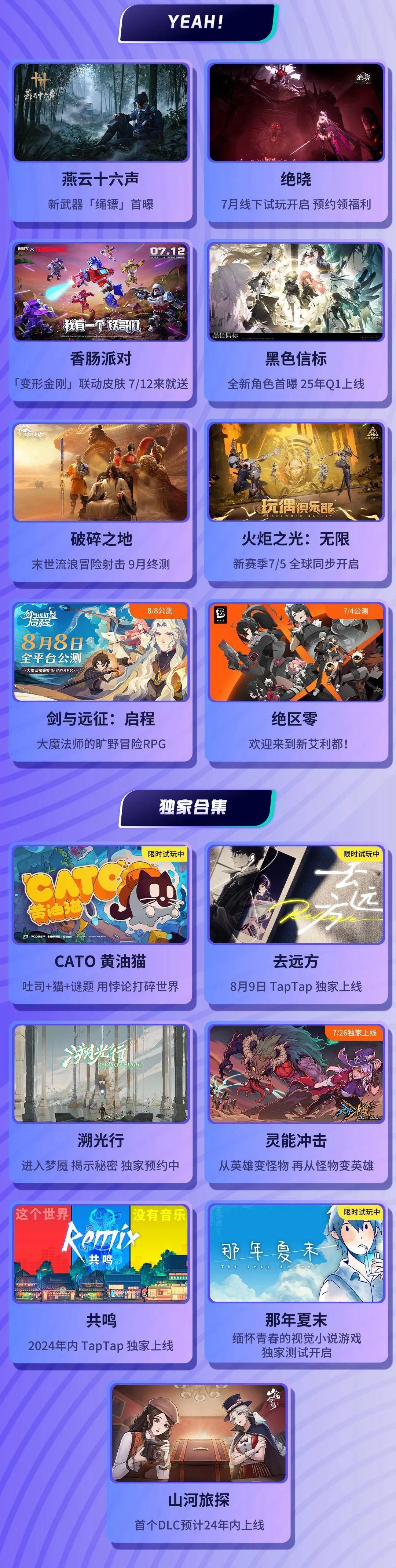 這次Tap發佈會公佈了多款獨家遊戲,可謂全面開花——成爲TapTap的獨家遊戲也逐漸變成廠商“真香”的選擇。不僅和傳統遊戲展一樣有播片,還把以往提供給媒體和線下的遊戲試玩擴展到了TapTap上。
