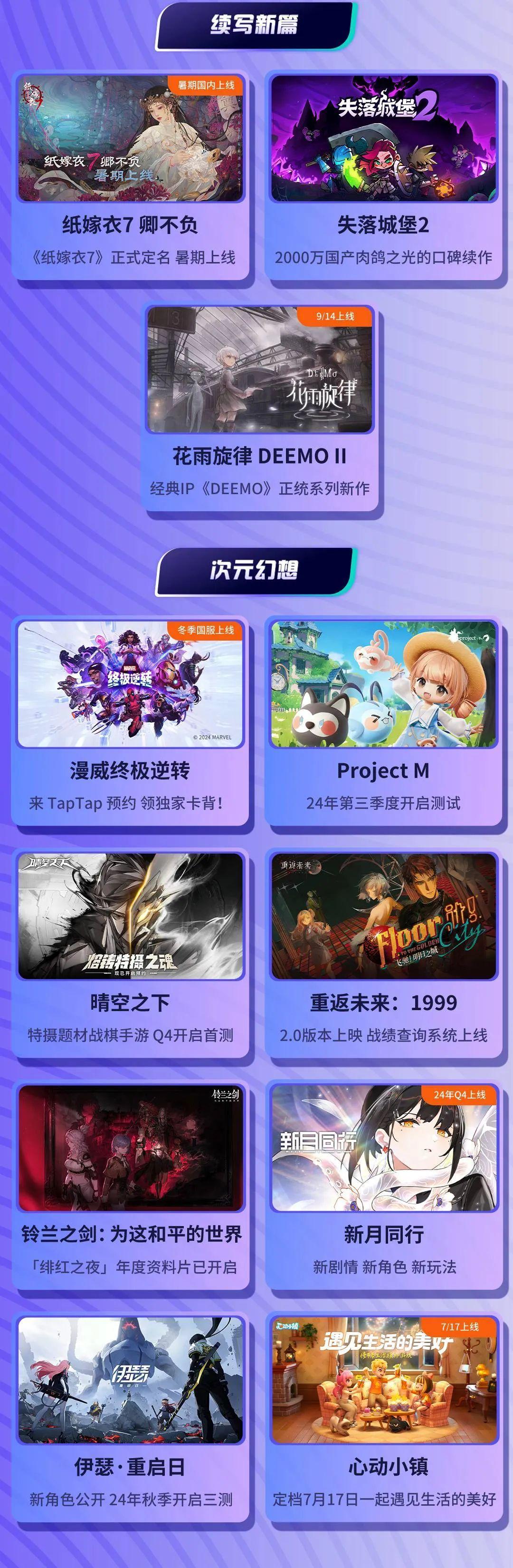 很多遊戲比如《劍與遠征:啓程》《花雨旋律 DEEMO II》《心動小鎮》等等,都選擇在TapTap發佈會上定檔,不搞飢渴營銷,不畫餅糊弄玩家。