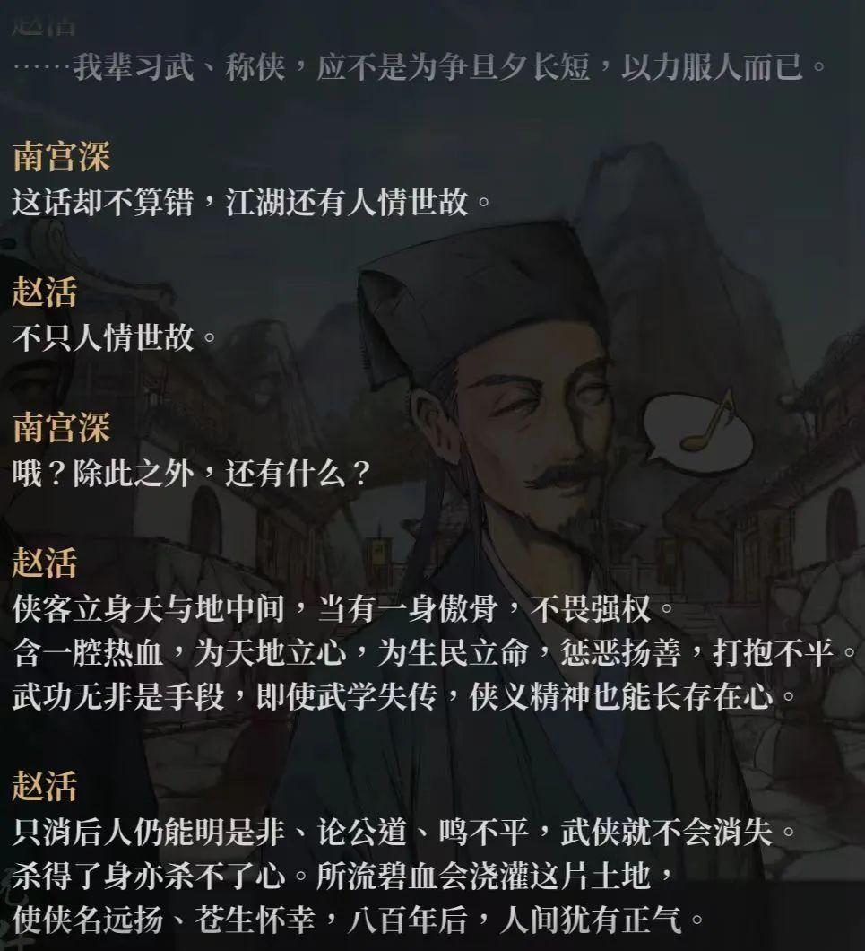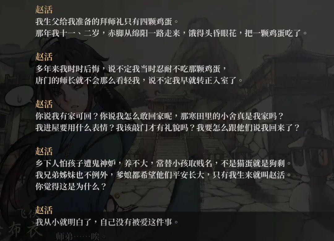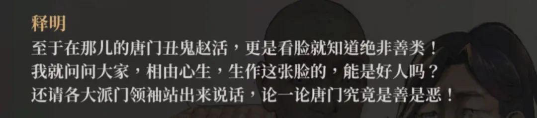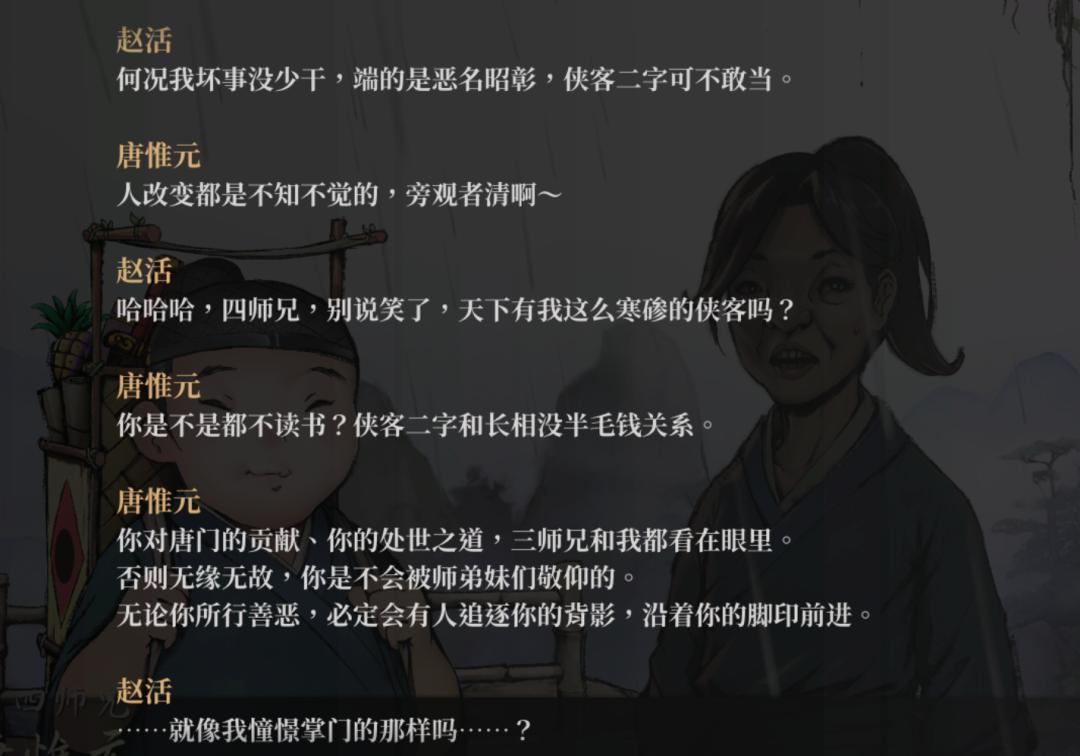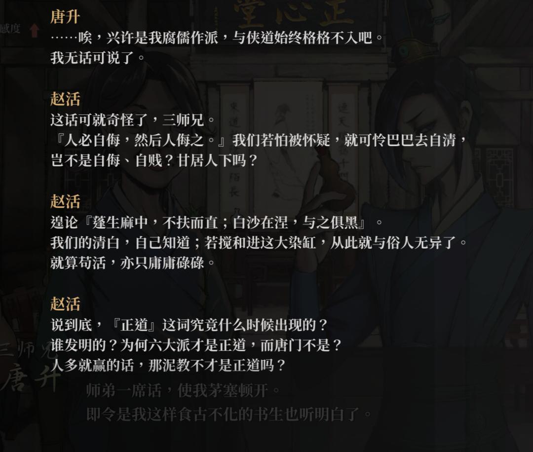 首先,《活俠傳》的文案很有武俠的感覺,既能適當地引經據典,又有足夠深刻的討論。比如唐門內部討論是否要自證,趙活在一項分支裏先是引用了孟子的話,繼而引用荀子的《勸學》來講道理,把飽學之士三師兄都辯得無話可說,也引發了玩家對正道的思考。