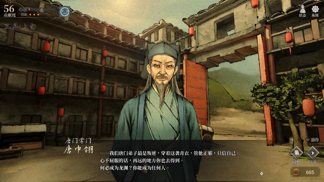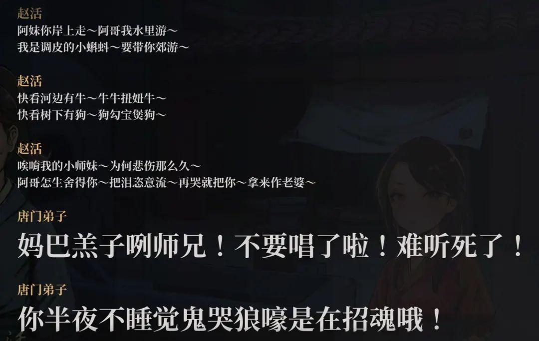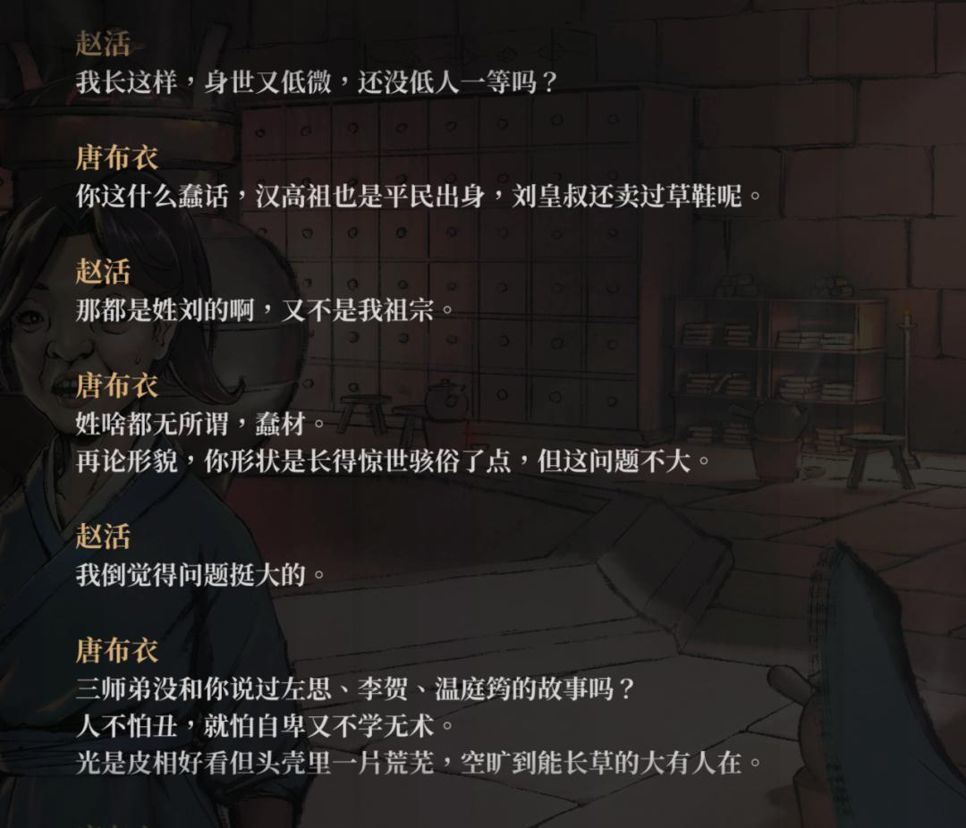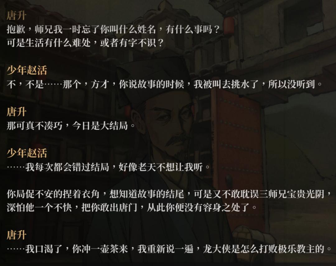 首先,《活俠傳》的文案很有武俠的感覺,既能適當地引經據典,又有足夠深刻的討論。比如唐門內部討論是否要自證,趙活在一項分支裏先是引用了孟子的話,繼而引用荀子的《勸學》來講道理,把飽學之士三師兄都辯得無話可說,也引發了玩家對正道的思考。
