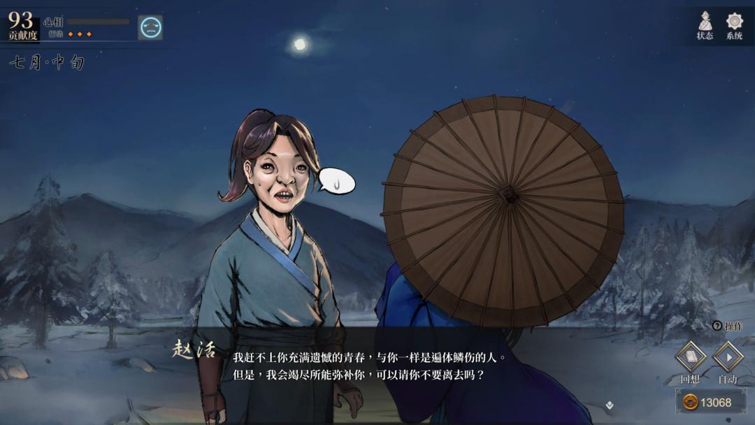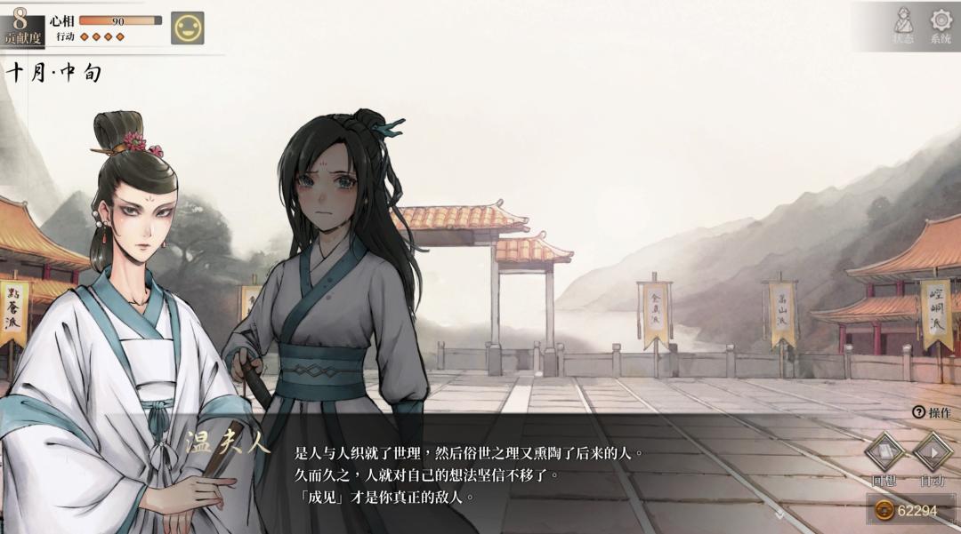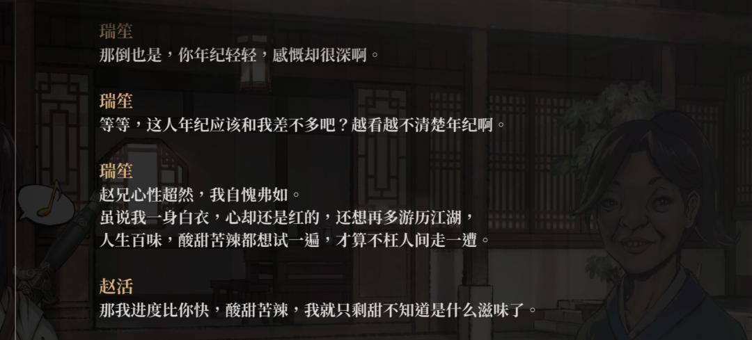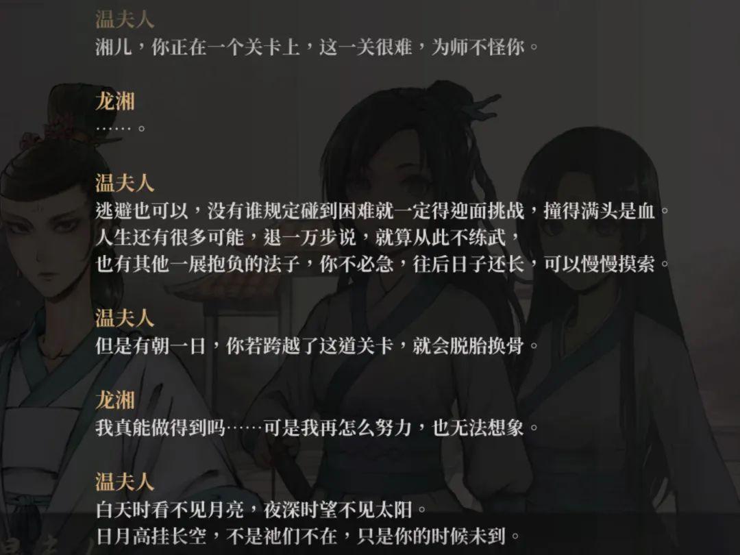 有時遊戲中的角色也不會像這樣掉書袋,但只是把尋常道理用自己的方式表述出來,同樣別有一番滋味。比如溫夫人對龍湘所說的:「白天時看不見月亮,夜深時望不見太陽。日月高掛長空,不是它們不在,只是你的時候未到。」