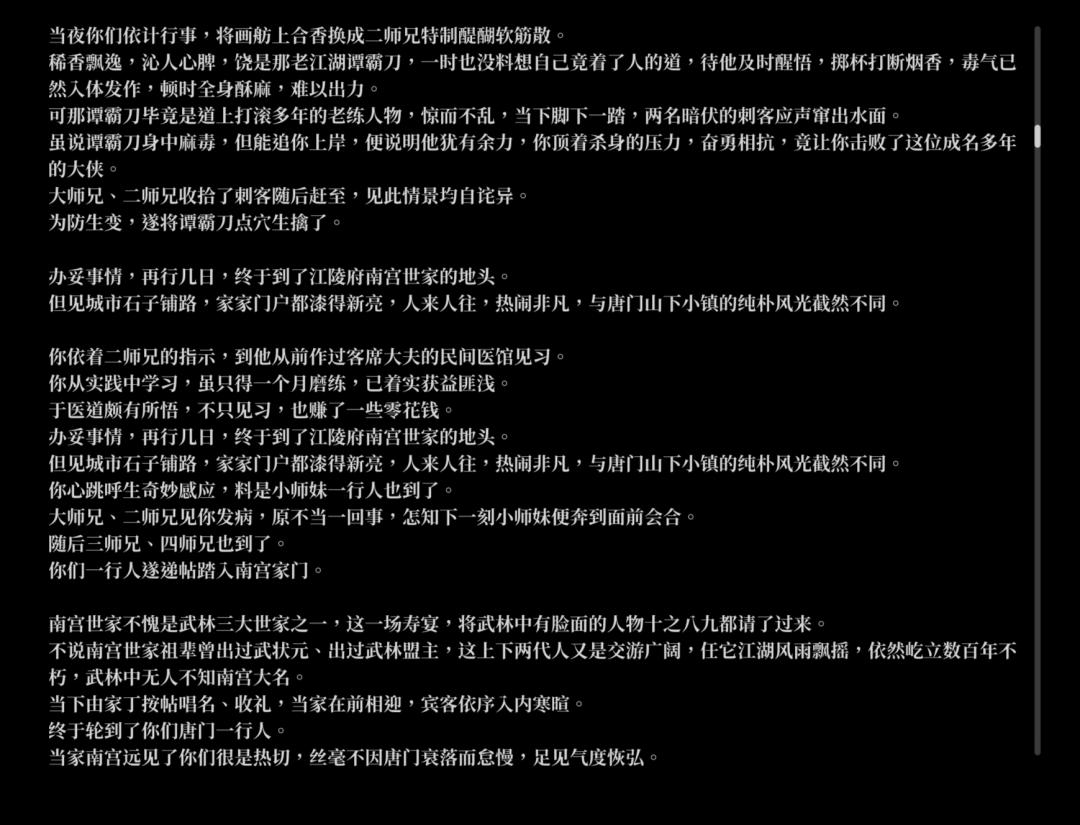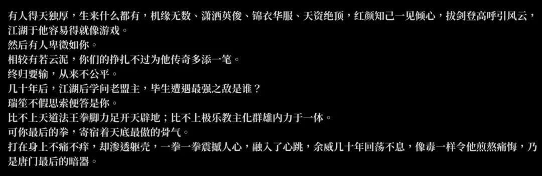 第二層,是它並非很多人印象裏的惡搞遊戲,所表達的內容,也不是傳統武俠、爽文網文的套路。恰恰相反,它用極高的敘事和文字水平,把家國情懷、武林祕辛、兒女情長,都描寫得蕩氣迴腸。在內核層面,對武俠的解讀也入木三分,既經典雋永又不落俗套。