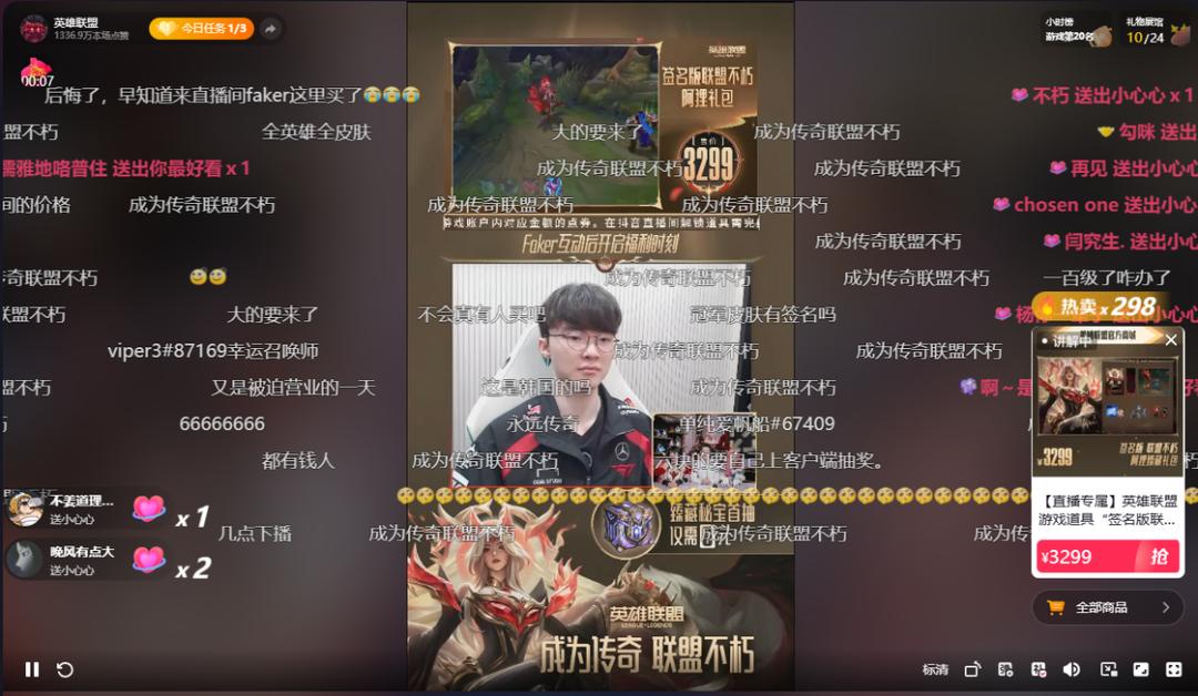 開播不到十分鐘,已有10w+用戶湧入直播間圍觀,期間上線的直播間福利更是被多次搶空。直播過程中,Faker中文互動、展示名人堂阿狸皮膚等內容也是節目效果拉滿。