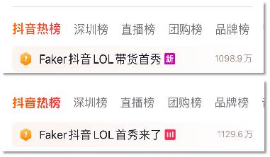 抖音平臺數據顯示,當日直播共有1016.5萬人看過,相關話題#Faker抖音LOL首秀來了,霸榜抖音話題榜近18小時。而就在十天前,Faker帶貨首秀消息剛剛公佈之時,相關話題#Faker抖音LOL帶貨首秀,同樣達成霸榜,時長高達25小時。