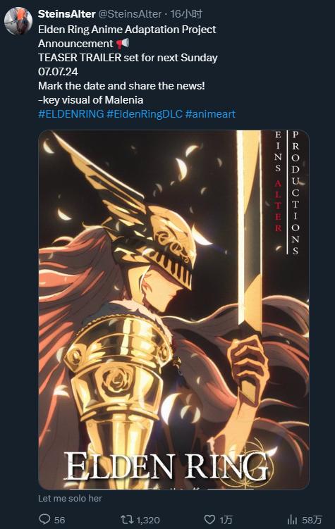 油管UP主SteinsAlter領頭製作了《艾爾登法環》的同人動畫,今天他在個人推特上放出了女武神瑪蓮妮亞的視覺圖,同時預告將在7月7日放出第一支預告片。