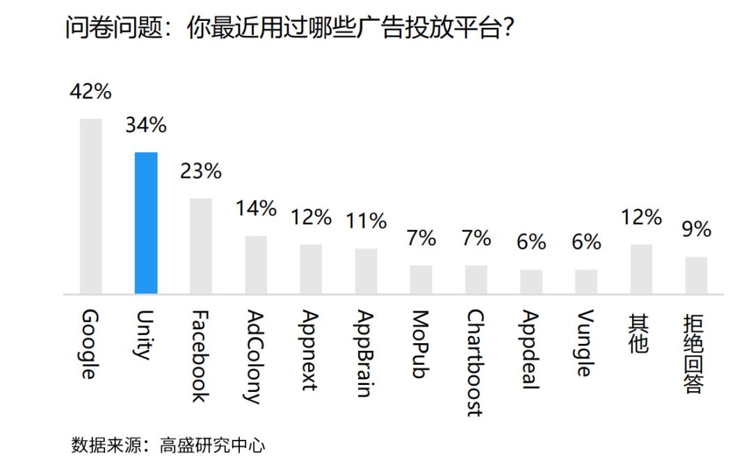 據三方統計,廠商在Unity投放廣告的每月展示次數高達 230 億,且是受訪廣告主中支持率第二的廣告平臺(第一爲谷歌,第三爲Facebook);而Unity官方數據也顯示,全球下載量前 100 的遊戲中有 84% 使用了其廣告業務。