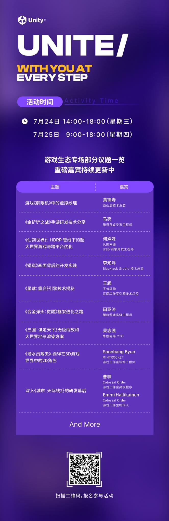 比如前面提到的Unite 2024大會,即將於7月23日在上海正式舉辦,並將帶來Unity技術、遊戲生態、團結引擎、Unity增長等7大專場的100多場演講,以及針對開源鴻蒙、微信小遊戲、Apple Vision Pro的開發工坊……我想,這將是不少開發者接觸行業前沿一次不錯的機會。