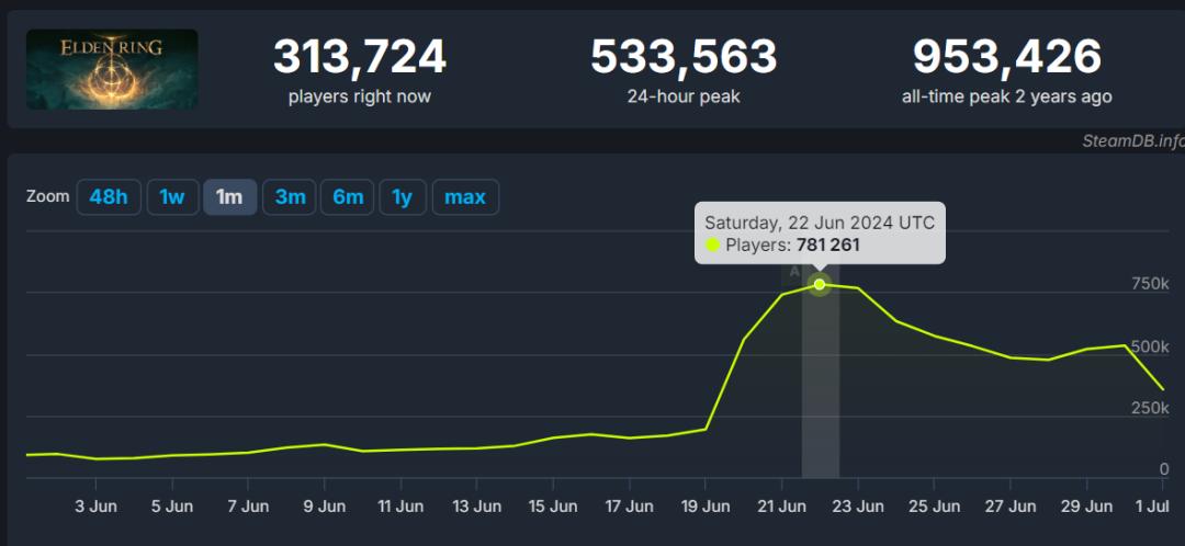DLC的發售也引起了玩家和粉絲的熱潮,根據SteamDB的數據統計,近期《艾爾登法環》的Steam同時在線人數再次迎來高峯,最高的時候達到78萬人,距離兩年前95萬人同時在線的巔峯時刻也不遠了。