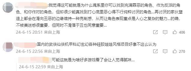 也有玩家對國內遊戲的美術風格提出質疑:有對比才能產生美,而很多項目的美只是在堆一個絕對值,導致最後做出來的內容,只有浮於表面的外貌美,或者只能讓角色帥、拽、漂亮,而沒有內在的美。