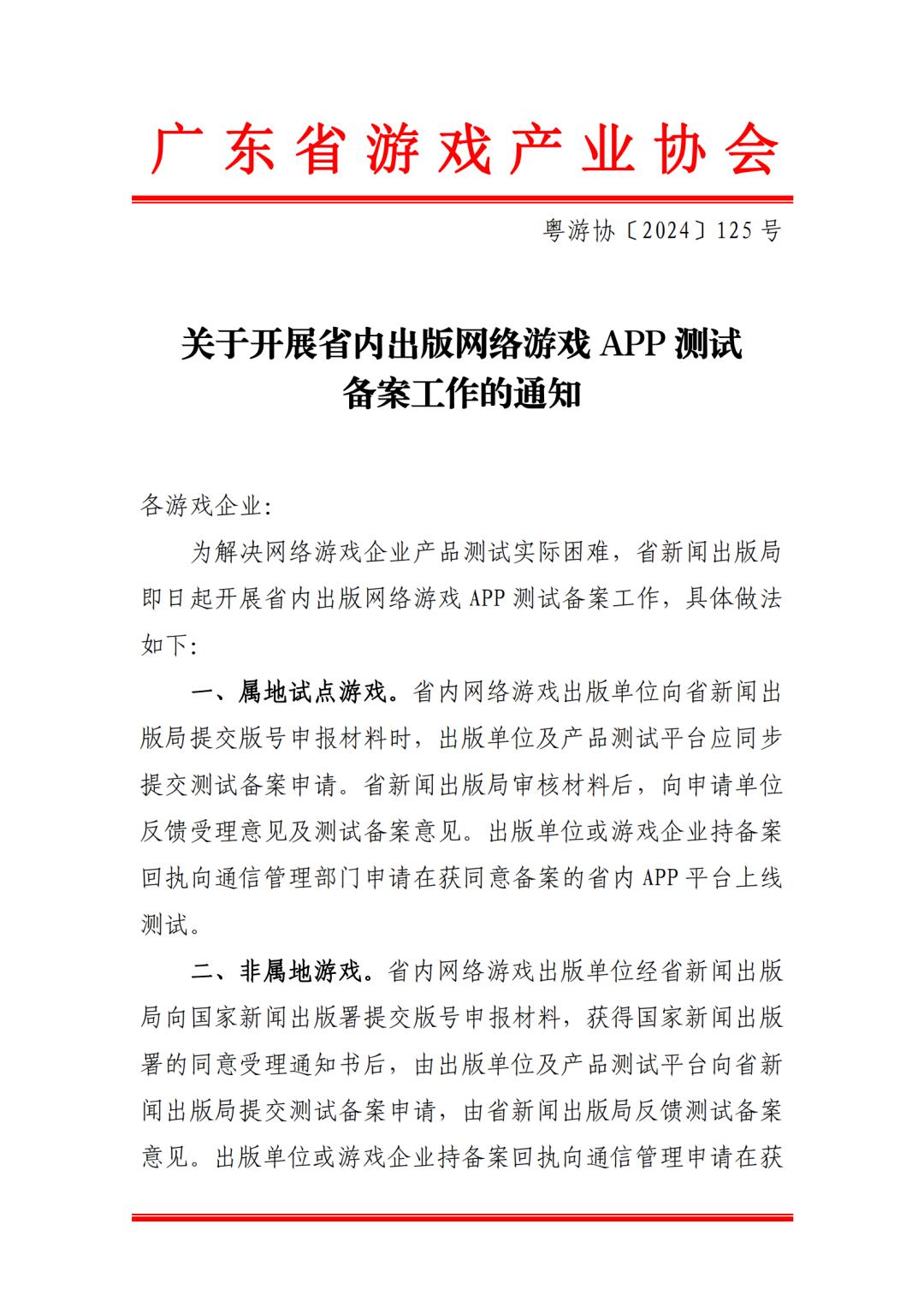 7月1日,廣東省遊戲產業協會發布了《關於開展省內出版網絡遊戲APP測試備案工作的通知》,表示即日起,廣東省新聞出版局將開展省內出版網絡遊戲APP測試備案工作。