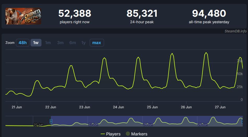 眼瞅着高考結束,正是拉着三五個同學一起打遊戲開黑的好時機,這不小弟現在正愁給大家找點什麼遊戲開黑的時候,就發現Steam上一款叫做《鏈在一起(Chianed Together)》的遊戲突然火了。
