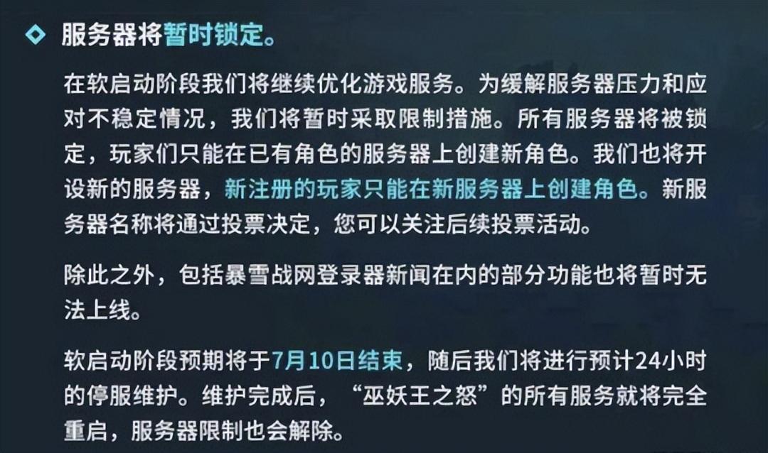 同時,網易也是指出了在軟重啓期間,新玩家無法在舊服務器上創建角色,想玩只能去新服,且會在7月10日這天開啓24小時的停服大更。
