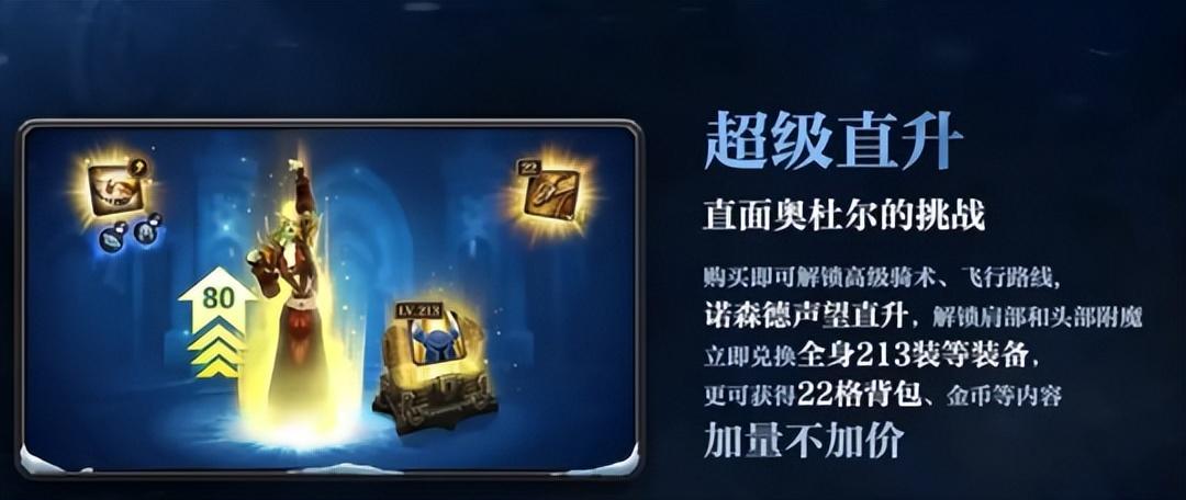 因此,網易也是及時公佈了停服的補償方案,其中有一條爲加量不加價的“超級直升”大禮包。這個大禮包不僅能讓角色直升80級,拿全諾森德的聲望,還能兌換一套213裝備,拿滿22格揹包,還有6萬金幣可以用來補齊其他道具。