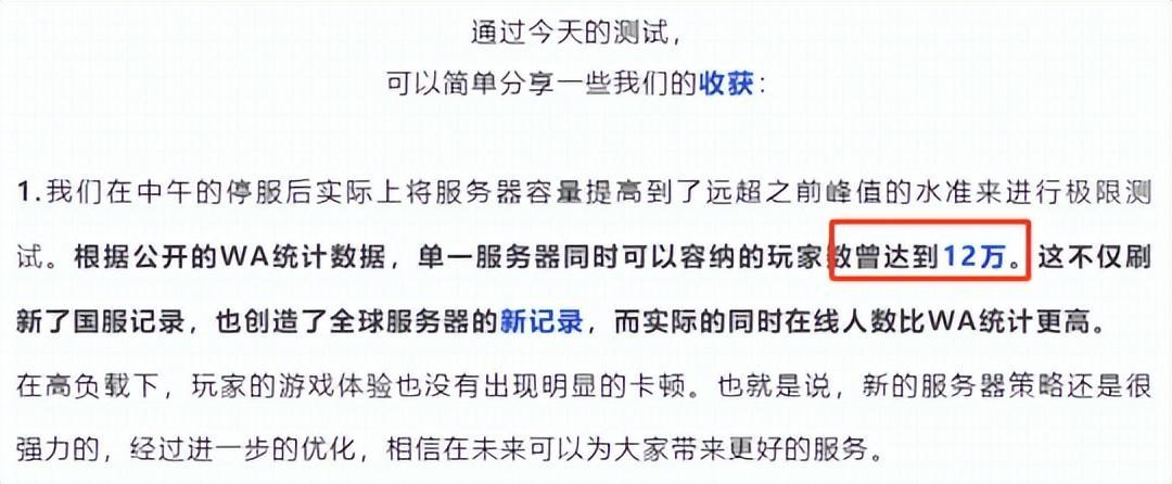 事後,根據官號分享的數據來看,單服務器玩家同時在線率一度飆到了12萬,不僅刷新了國服的數據,也是創造了全球服務器的記錄。另外,參與測試的玩家也都表示卡頓跟排隊都不是很明顯,明顯感覺到服務器質量好了很多。