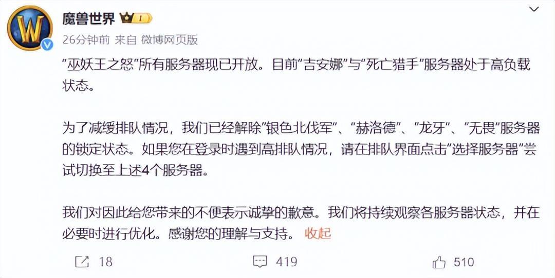 只不過,半場開香檳的下場一般都不咋好,後面阿里雲服務器就因爲陸續崩潰,上了微博熱搜,而他們在《魔獸世界》WLK懷舊服軟重啓期間的表現也一般。