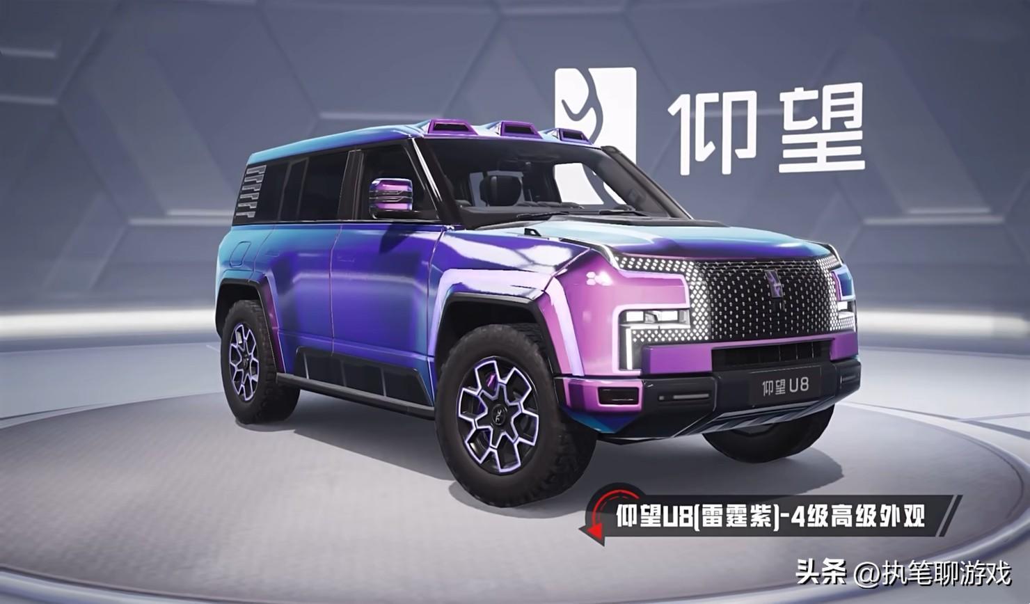 接下來出場的是U8的4級高級外觀,顏色也是從紫色變成了“藍紫”,而且似乎有點五彩斑斕的感覺,頂棚通常從純黑色變成了藍紫,細節方面也出現了些許變化,比如車頂上方的探照燈,不過建模沒有再次調整。