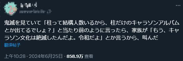 秉持着角色形象完整,如果有一首角色曲來搭配就再好不過的想法,有粉絲在日推上調侃,說在和家人聊天時暢想所有柱會合在一起,出一張角色歌專輯。隨後就被家裏人潑了一盆冷水:“角色歌這種文化已經滅絕了。現在已經是令和了。”