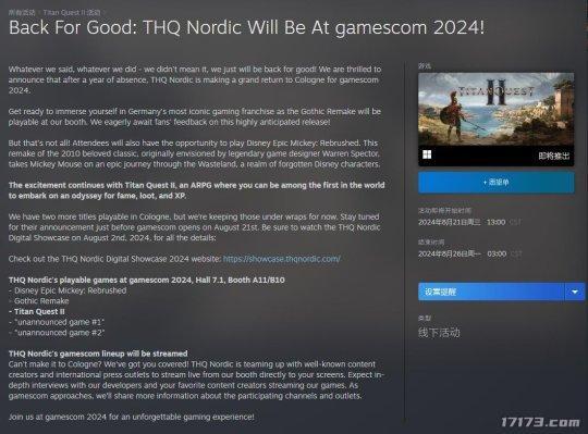 近日官方發佈公告,表示將回歸參加2024德國科隆國際遊戲展(展會時間爲8月23日至27日),並且會在8月2日的“THQ Nordic Digital Showcase”直播活動上,應社區的要求,首映遊戲的實機預告片。