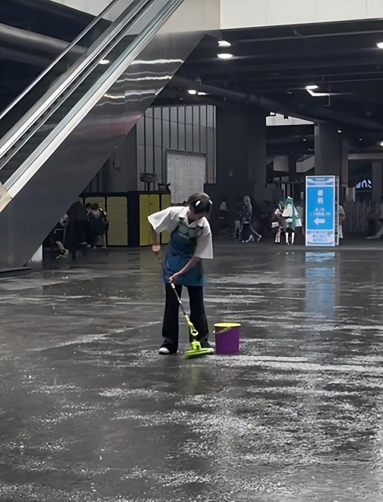還有人玩起碇真嗣大戰水天使的梗,在漫展外面冒雨拖地,拖把用的還是EVA細節配色: