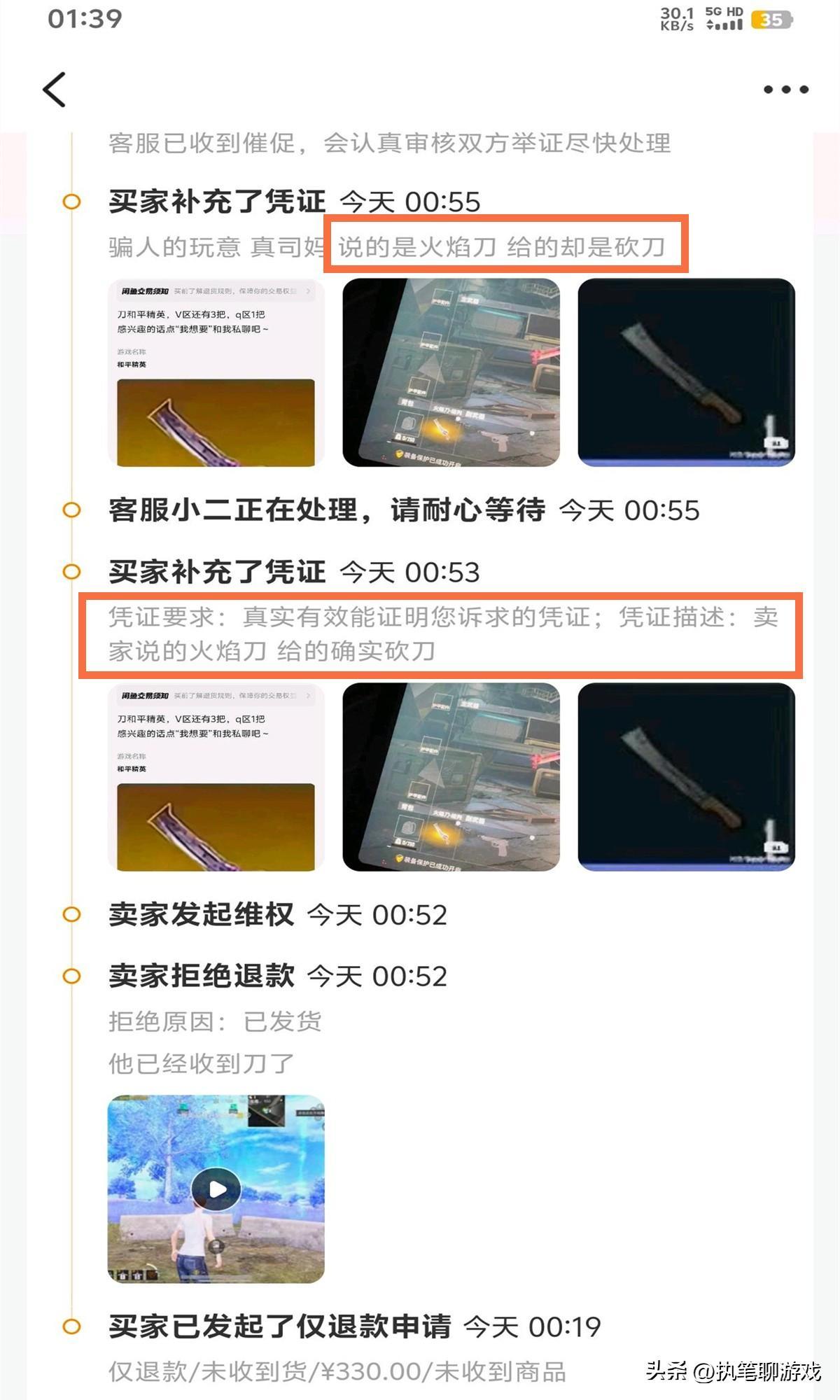 如圖所示,通過這張截圖不難看出,這位玩家用330R置換心儀已久的火焰刀,結果對方卻拿出了一個“大砍刀”,於是就出現了這樣的“補充憑證”,着實是讓人啼笑皆非,畢竟大砍刀變成火焰刀,天哥都沒忍住笑出了鵝叫聲。