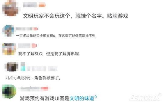 有網友就吐槽,《文明》玩家不會玩這個,這就掛個名字的貼牌遊戲。還有網友表示,一百多塊我能買《文明6》了,在這裏可能保底都抽不到。還有玩家調侃,我不瞭解SLG,但是我瞭解騰訊啊。此外還不少有玩家遭遇惡性BUG,說幾個小時沒玩,回頭角色就被刪了。