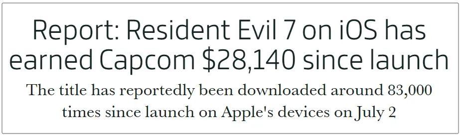 《生化危機7》在iOS平臺發售已經有半個月了,然而其下載量纔剛超過8萬次,付費用戶還不到2000人(需要付費才解鎖全部內容)。卡普空通過IOS版獲得的收入,可能還不足3萬美金。