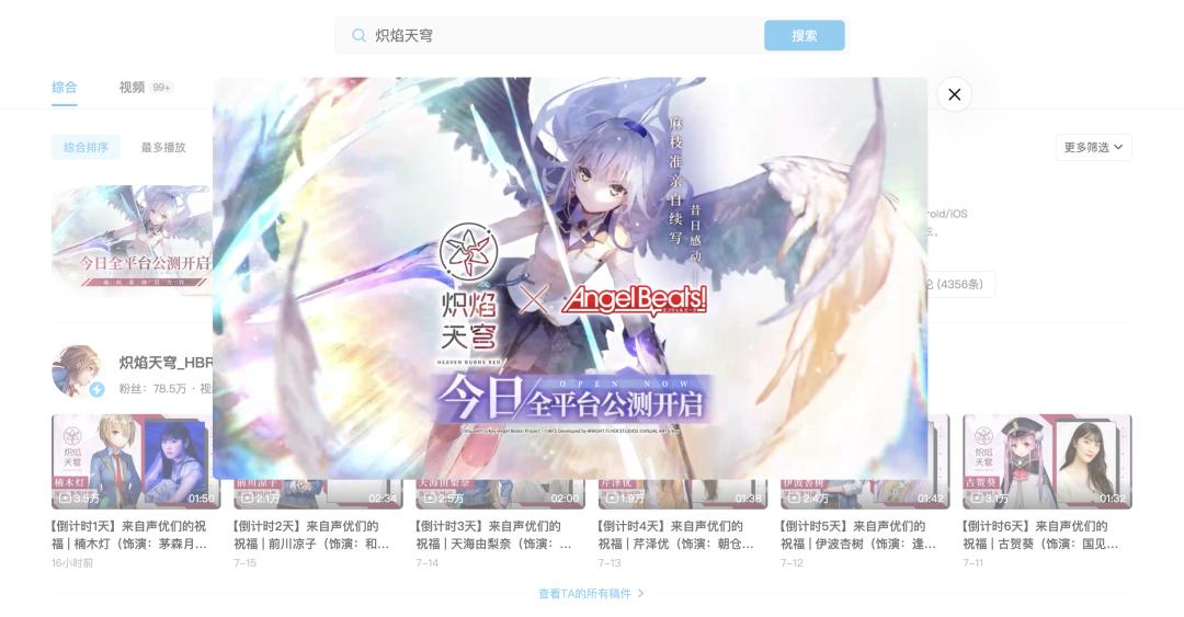 《HBR》的宣發也很熱鬧,B站首頁有全平臺公測的Banner,而當我搜“紅燒天堂”、“熾焰天穹”,甚至會跳出來彈窗播放視頻。