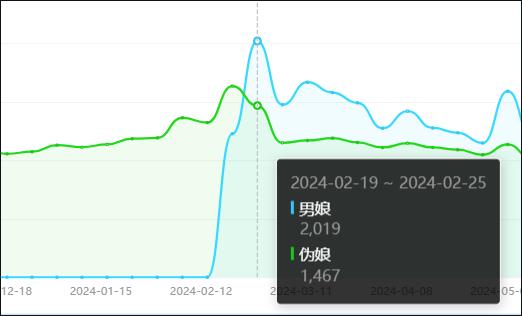 回到“男娘”與“僞娘”的話題,在圖一樂的百度指數上,男娘這個稱呼好像是一夜之間,雨後春筍一般冒出來的。