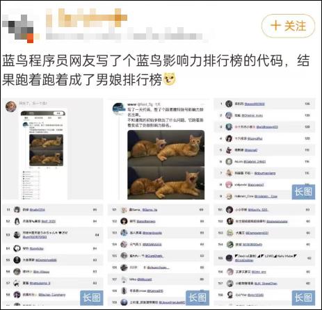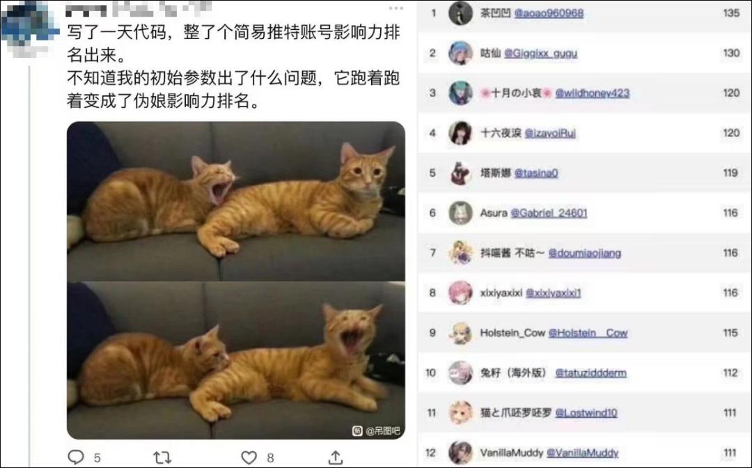 男娘也不僅僅是之前提到的,有女性特質的男性角色,在三次元也包括女裝大佬,僞娘,藥娘等各種羣體。記得兩年前推特有人調侃,自己做了個簡易推特賬號影響力排名,但是跑着跑着就變成了僞娘影響力排名。