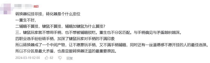 手柄和鍵鼠的矛盾看似是玩家間的理念分歧,但本質上是重生不解決問題(分區或者表態其他解決辦法),把問題拋給玩家,任由其在社區裏增加裂痕。