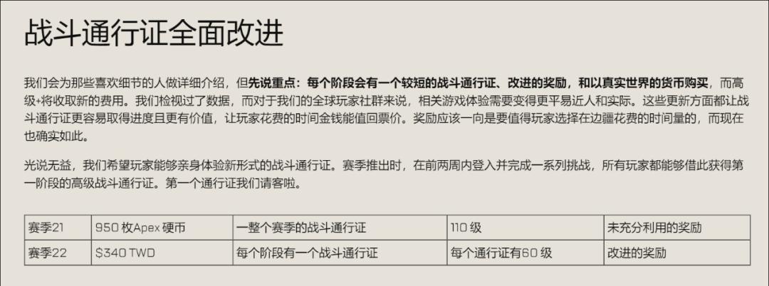 當時我們在B報裏提到過,《Apex英雄》發公告宣佈,對遊戲內的戰鬥通行證進行全面改進,從22賽季開始,通行證改爲每半個賽季更新,獲取最終外觀獎勵的等級從110級下調到60級,增加了免費和高級路徑的獎勵...所謂的節奏更快,獎勵更多。