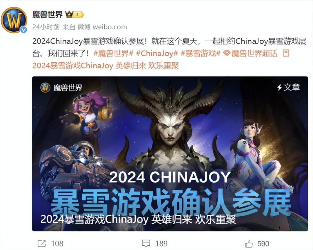 7月19日,《魔獸世界》官方發文稱暴雪遊戲確認參展2024ChinaJoy,他們將會給中國玩家帶來《魔獸世界》“地心之戰”、《爐石傳說》、《守望先鋒》等遊戲國服的最新內容,並提供新版本國服客戶端的試玩內容。