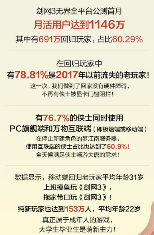 據悉,《劍網3》無界全平臺公測首月,月活用戶高達1146萬,其中有691萬迴歸玩家,佔比60.39%,而在迴歸玩家中有78.81%是2017年以前流失的老玩家,可見無界版的推出,確實打通了很多MMO老玩家想回歸又懶得在電腦上玩的一個大難題。